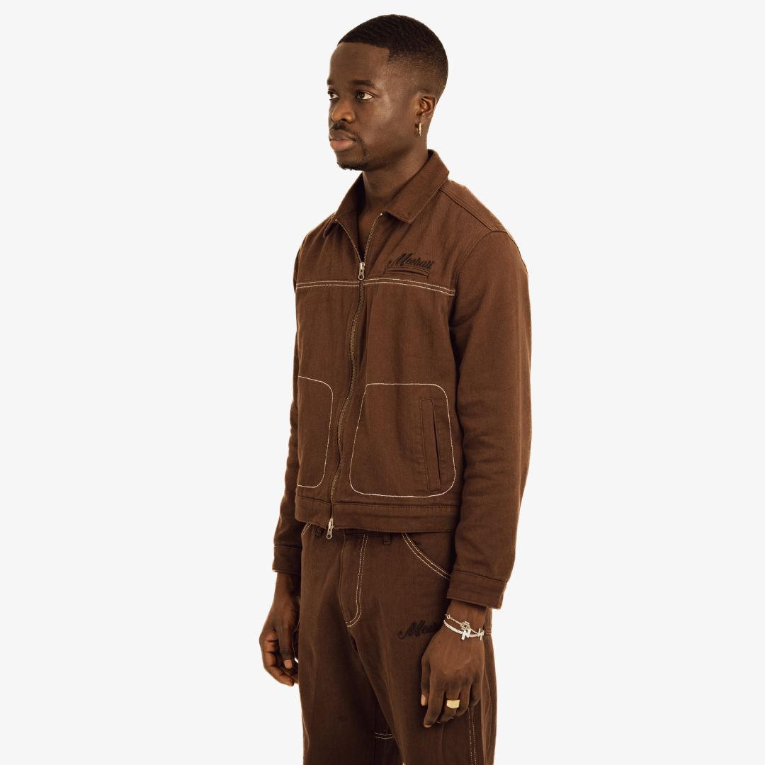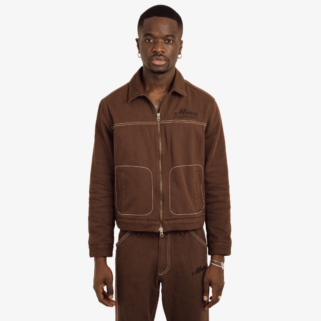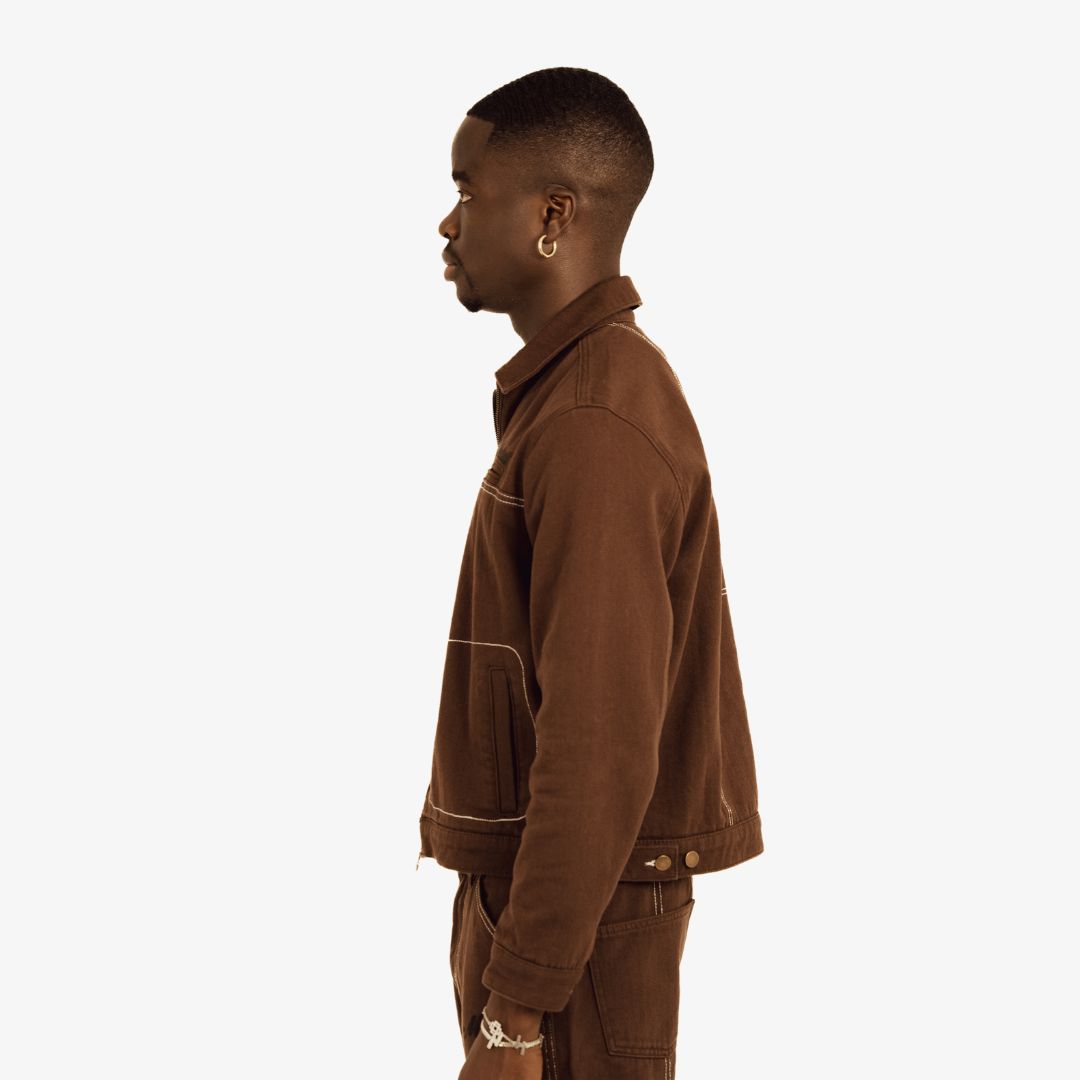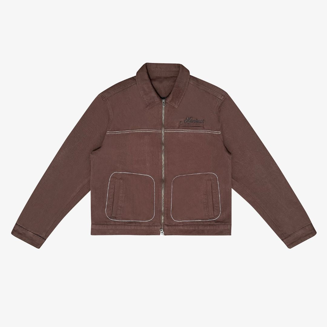 Introducing the Contrast Stitch Worker Style Jacket in coffee brown colorway, a slightly cropped and fitted jacket crafted made from luxury cotton twill fabric. The jacket contains contrast stich details throughout the garment, and a double ended zip closure to the front. Two large front pockets and embroidery detail to the back help elevate the jacket to the next level of luxury. The jacket is finished with silk lining for ultimate comfort.