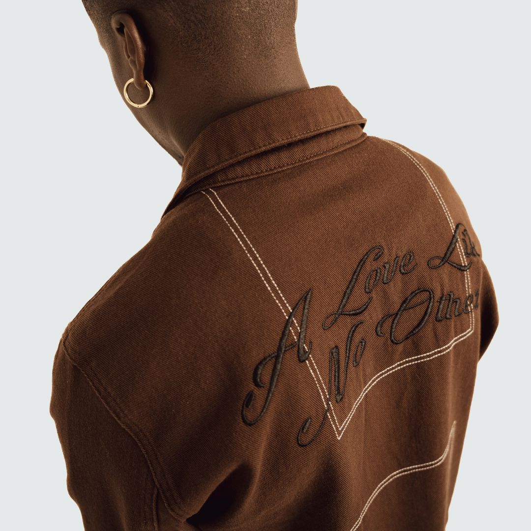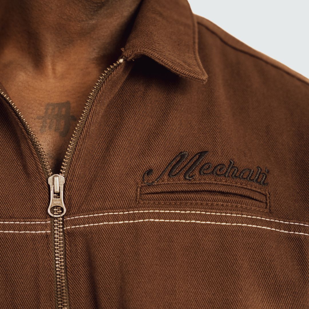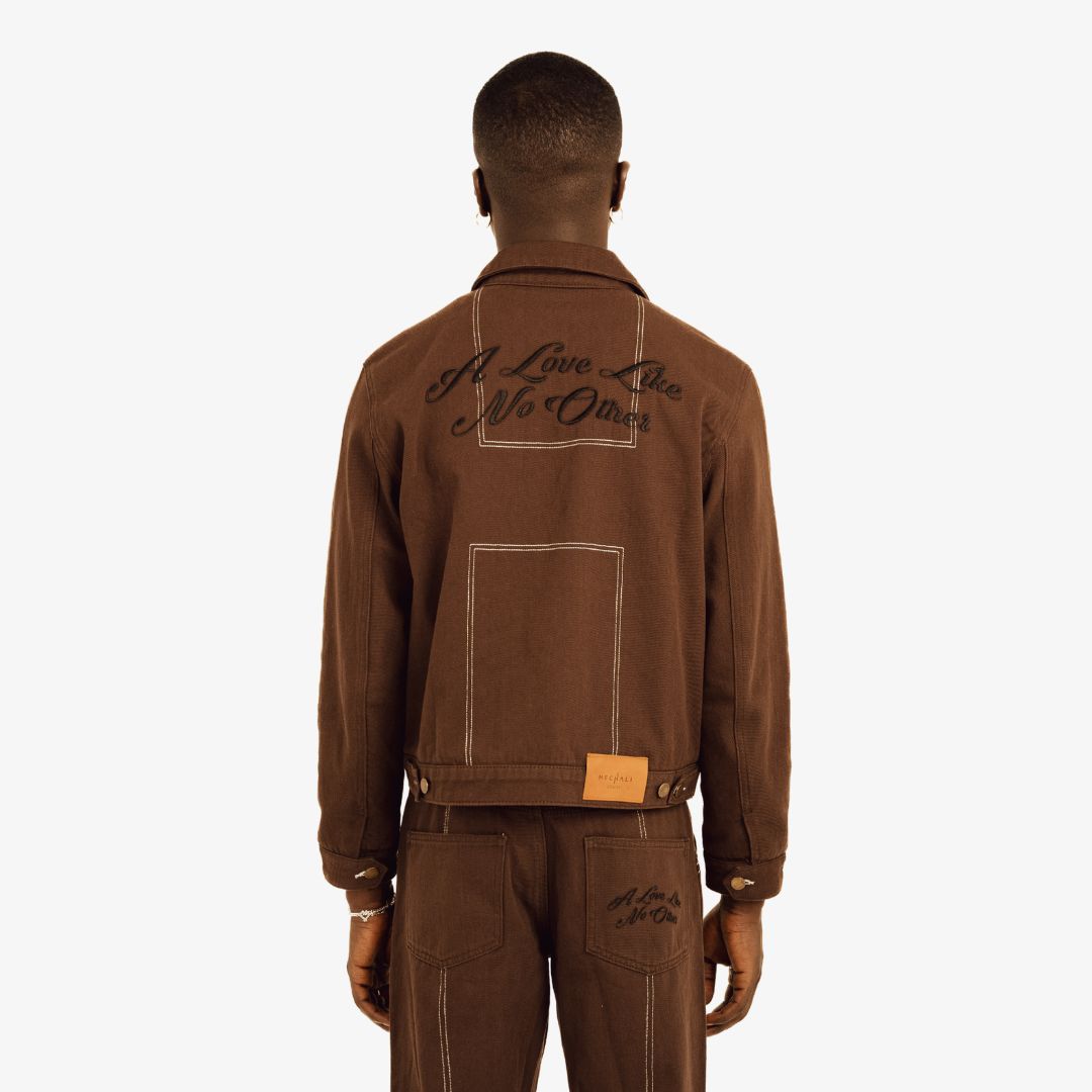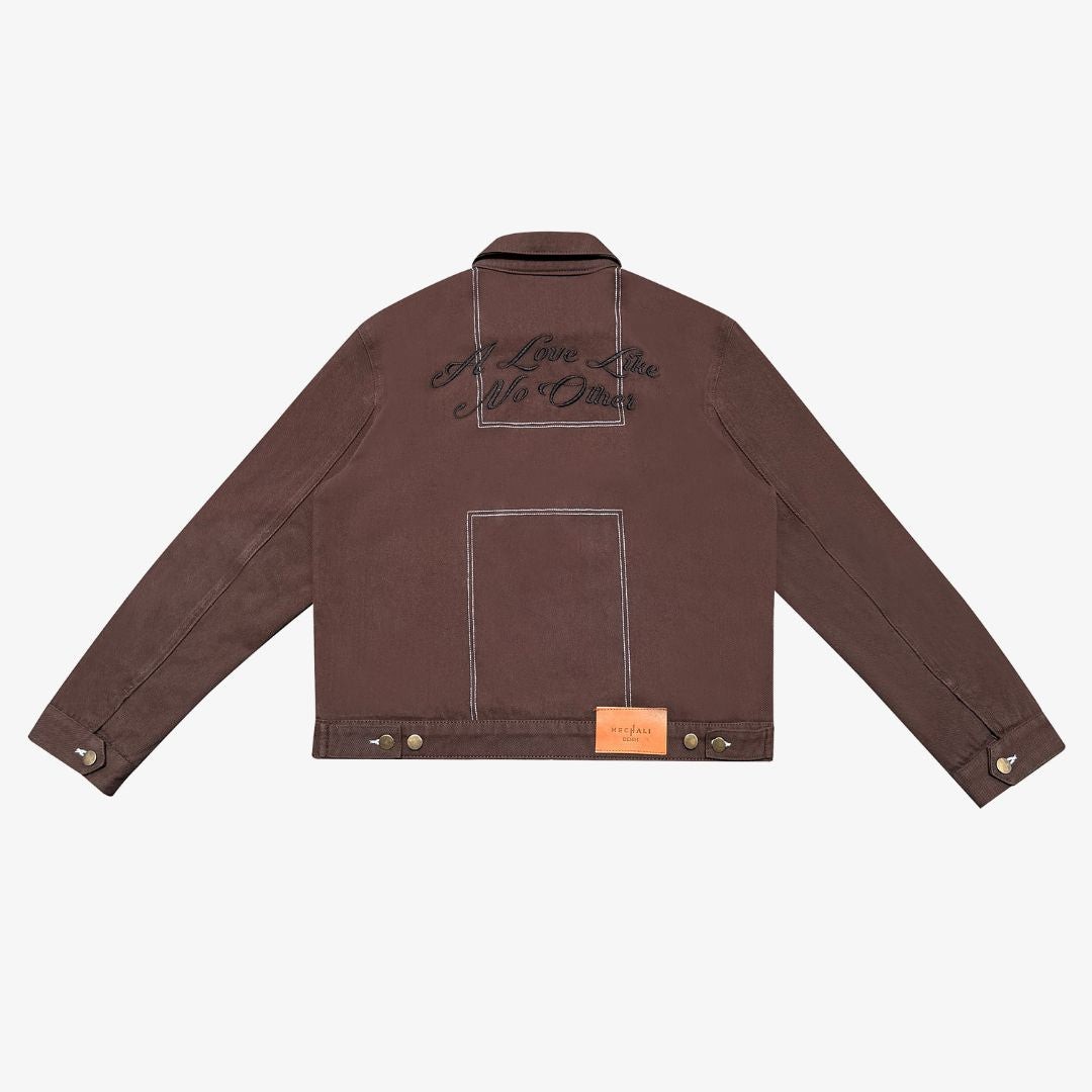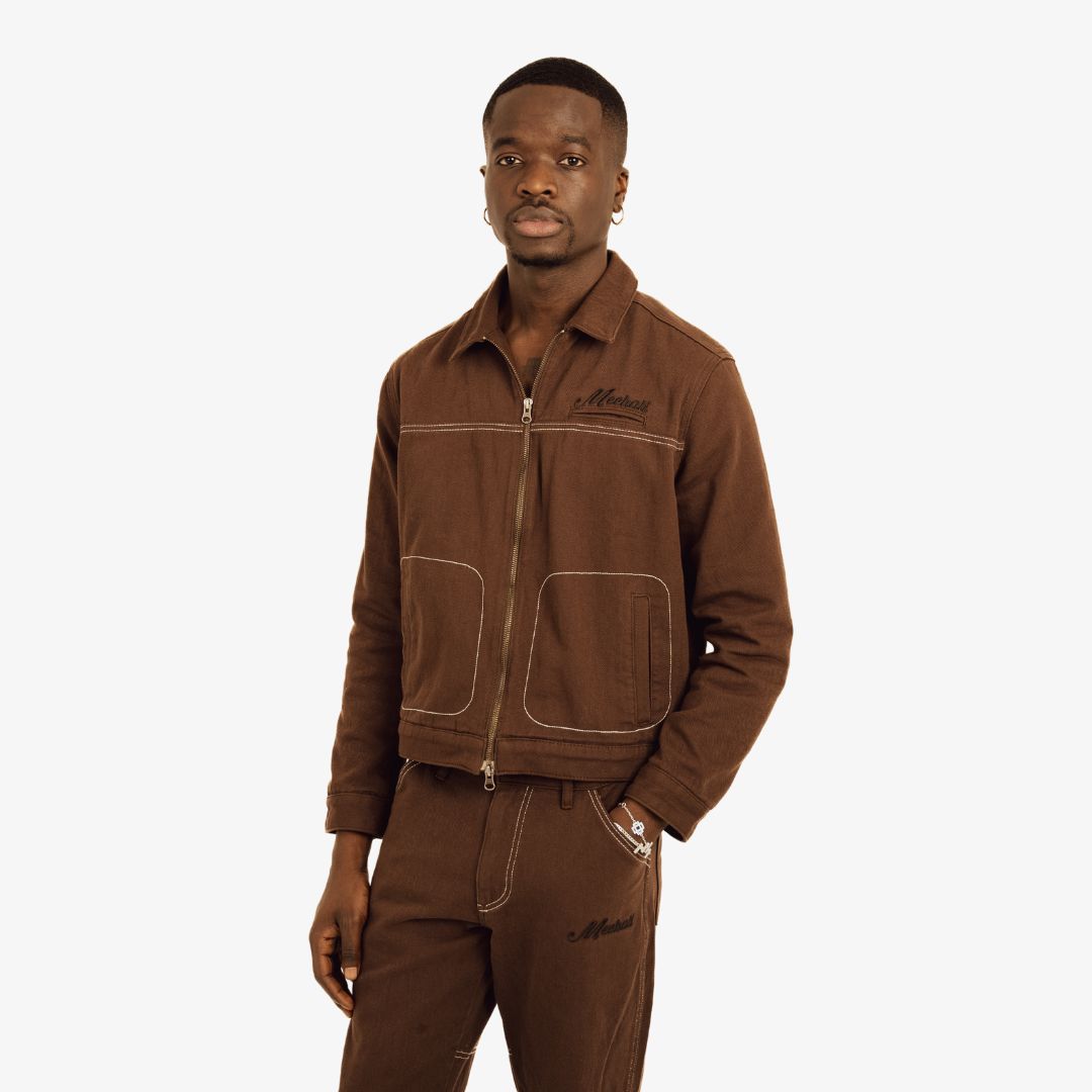 Introducing the Contrast Stitch Worker Style Jacket in coffee brown colorway, a slightly cropped and fitted jacket crafted made from luxury cotton twill fabric. The jacket contains contrast stich details throughout the garment, and a double ended zip closure to the front. Two large front pockets and embroidery detail to the back help elevate the jacket to the next level of luxury. The jacket is finished with silk lining for ultimate comfort.