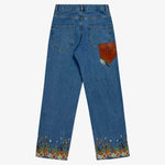 Our Relaxed Fit is constructed to be a baggier and more relaxed denim fit than our previously produced denims. Featuring our unique branded bird on the back right section of the denims, contrast red stitching down the sides of the legs, and picture-perfect floral embroidery on the bottom section. Finished off with five pockets, custom rivets, metal clips and our show-stopping 5TH year exclusive branded patch.